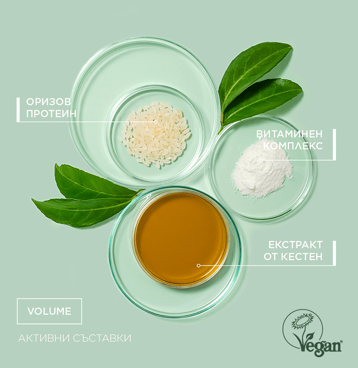 Vlasy sa skladajú prevažne z keratínu, ktorý má negatívne nabité časti. Sú ideálnym spôsobom na pripojenie rôznych látok, ktoré majú pozitívne nabitú časť. Ryžové proteíny sa však skladajú z rôznych aminokyselín, ktoré majú oba náboje. Pozitívne nabité časti sa k vlasom priťahujú a negatívne nabité sa navzájom odpudzujú. Týmto spôsobom sa vytvára prirodzený objem bez pomoci ďalších stylingových prísad alebo vysušovania vlasov. Zároveň majú ryžové proteíny vlastnosť vyživovať vlasy po celej dĺžke a chrániť ich pred poškodením. Ďalším známym faktom je, že vlasy bez objemu sú často tenké a bez života. Preto je ich ochrana a hydratácia mimoriadne dôležitá. Preto je formulácia zložiek, ktoré vytvárajú na vlasoch jemný, prirodzený, ochranný film, pomáhajú udržiavať optimálne množstvo vody a zvyšujú ich schopnosť odrážať svetlo. To vedie k zvýšeniu lesku vlasov. Jednou z takýchto zložiek je extrakt z gaštanu. V neposlednom rade je tu formulácia vitamínov, ktoré vlasy ďalej posilňujú. Vitamíny sú uzavreté v špeciálnom lipozómovom systéme, ktorý zvyšuje ich aktivitu. Výsledkom všetkých zložiek dohromady sú zdravé a objemné vlasy s krásnym leskom, ktoré sa ľahko upravujú.